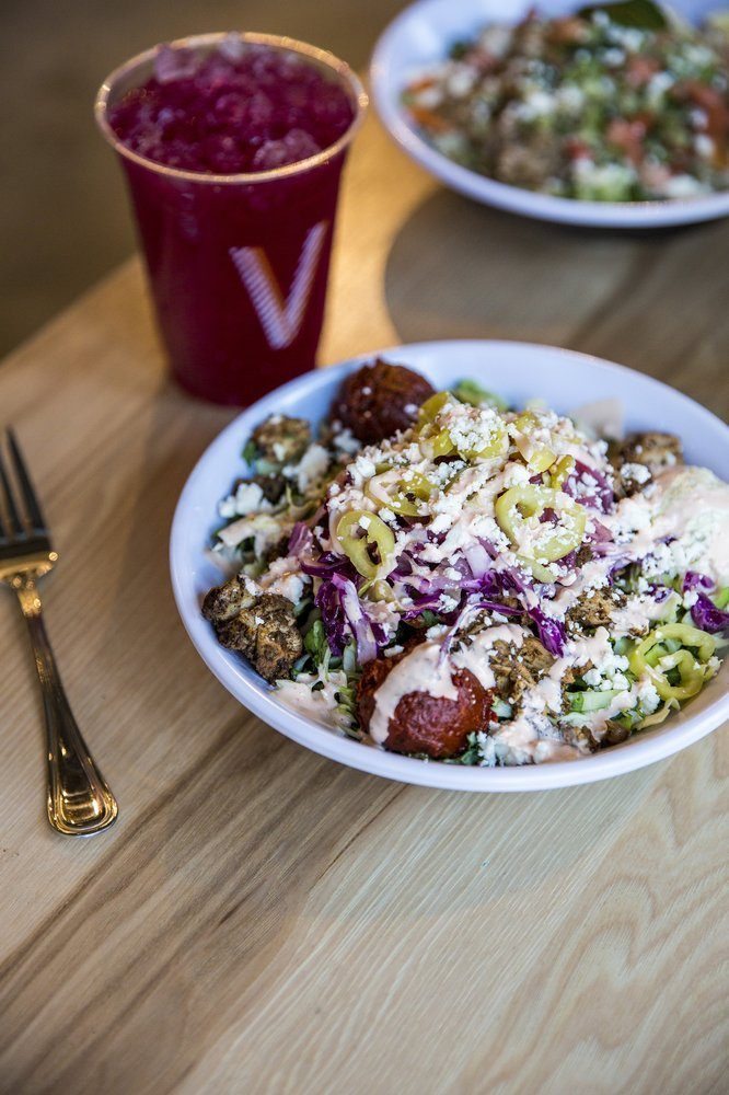 Spicy lamb meatballs, avocado, Crazy Feta, red pepper hummus, pickled onions, lentils, lemon herb tahini, more
