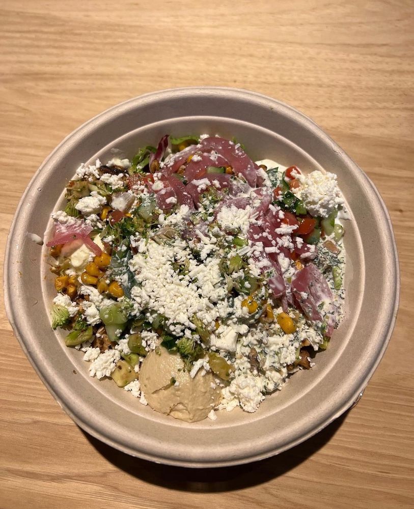 Grilled chicken, brown rice, tzatziki, hummus, feta, pickled onion, tomato, arugula, Greek vinaigrette, and more.